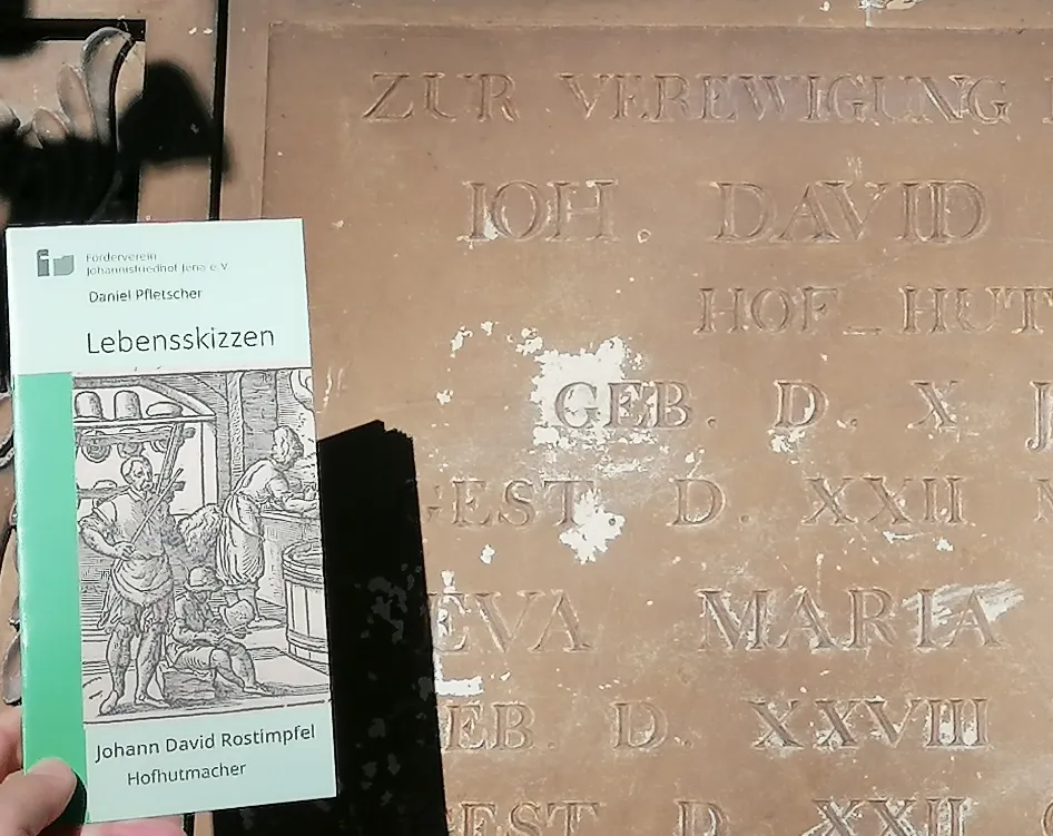 Vor wenigen Tagen ist Heft 37 der Reihe erschienen. Sie beschreibt das Leben des ehemaligen Hofhutmachers Johann David Rostimpfel, der 1744 in Pößneck als J. D. Roßtümpfel geboren wurde und in Jena 1816 starb. Auch der familiäre Hintergrund seiner Frau Eva Maria Grellmann wird beleuchtet. Wer das Grab der Eheleute besucht, wird die augenfällige Ausgestaltung mit Symbolen der Freimaurerei bemerken.